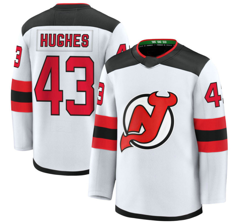 Rep your New Jersey Devils #43 Luke Hughes Away Premium White Jersey, engineered for die-hard fans and active play. Built with performance-grade fabric, its midweight construction delivers enhanced flexibility and movement, whether you're leaping from your seat or skating on ice. The ergonomic drop-tail hem and side vents ensure unrestricted motion, while advanced sweat-wicking technology combats heat to keep you dry through overtime thrills. From the Prudential Center stands to backyard pickup games, this jersey merges bold Devils branding with pro-level functionality-so you can cheer (or compete) without limits.