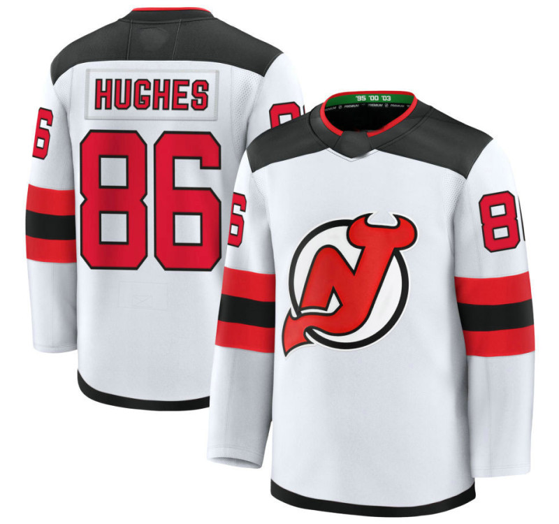 Upgrade your New Jersey Devils #86 Jack Hughes Away Premium White Jersey, meticulously crafted to mirror the team's on-ice intensity. This premium design features bold striping and crisp team branding, echoing the player iconic ice uniforms. Engineered with breathable mesh panels and a streamlined silhouette, it balances lightweight comfort and a modern fit, keeping you cool during high-stakes moments. Whether rallying at the Prudential Center or celebrating at home, this jersey blends authentic style and performance to fuel your loyalty in every cheer.